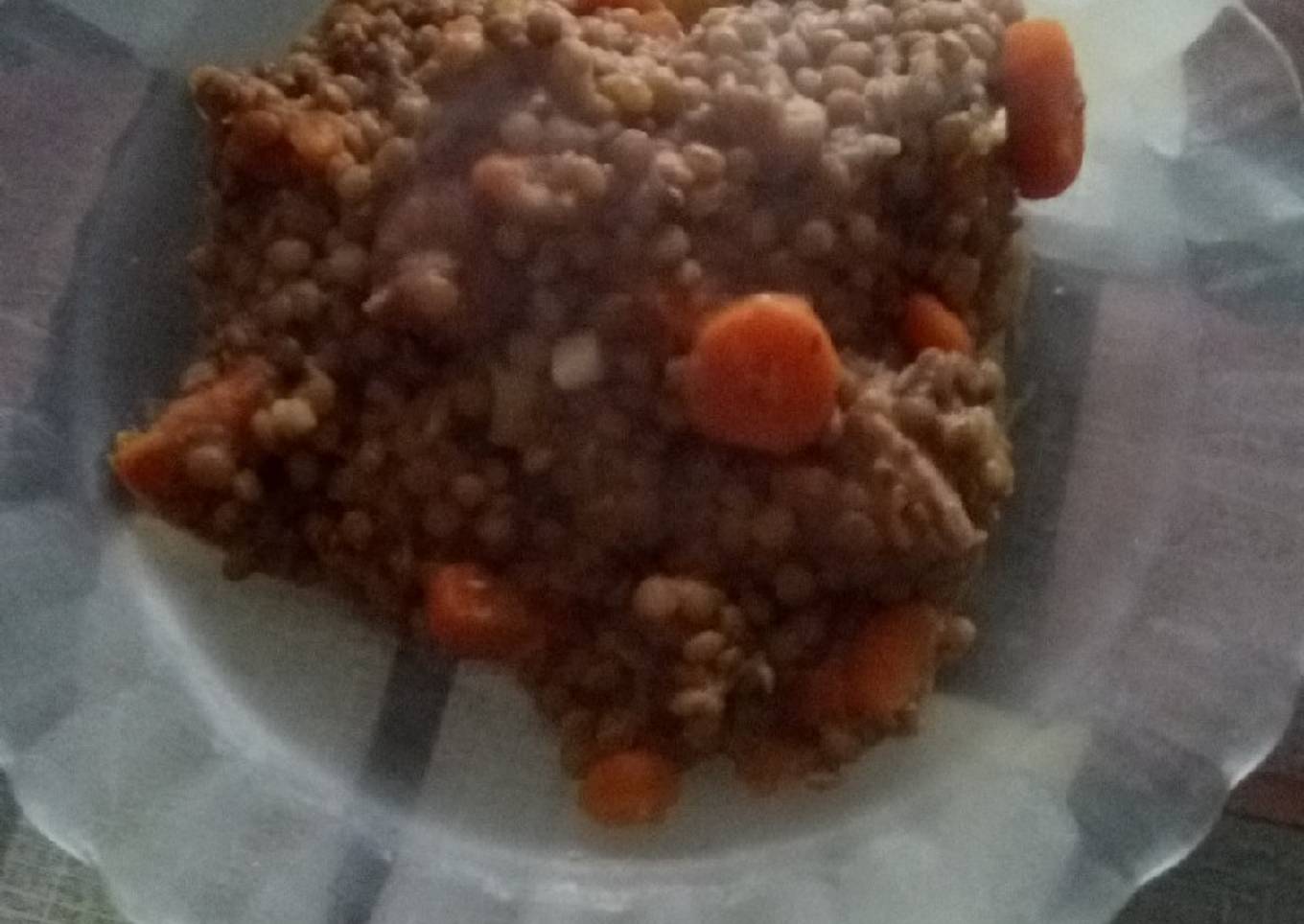 - Lavamos las lentejas, echamos las verduras y la carne peladas y cortadas en una olla