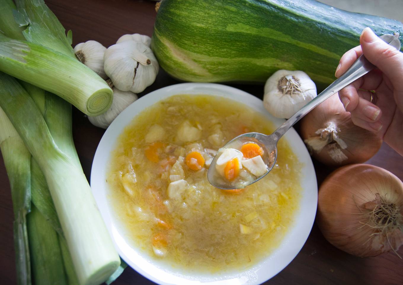 - Limpiamos y cortamos en trozos pequeños el blanco de los puerros. Hacemos lo mismo con la zanahorias, la calabaza y los ajos.