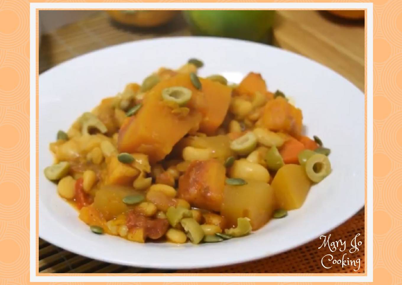 - Cuando comience a hervir le agregamos la calabaza, movemos y le añadimos las alubias cocidas, para que se integren, le ponemos un poquito de Cúrcuma, movemos y lo dejamos unos 20 minutos al fuego.