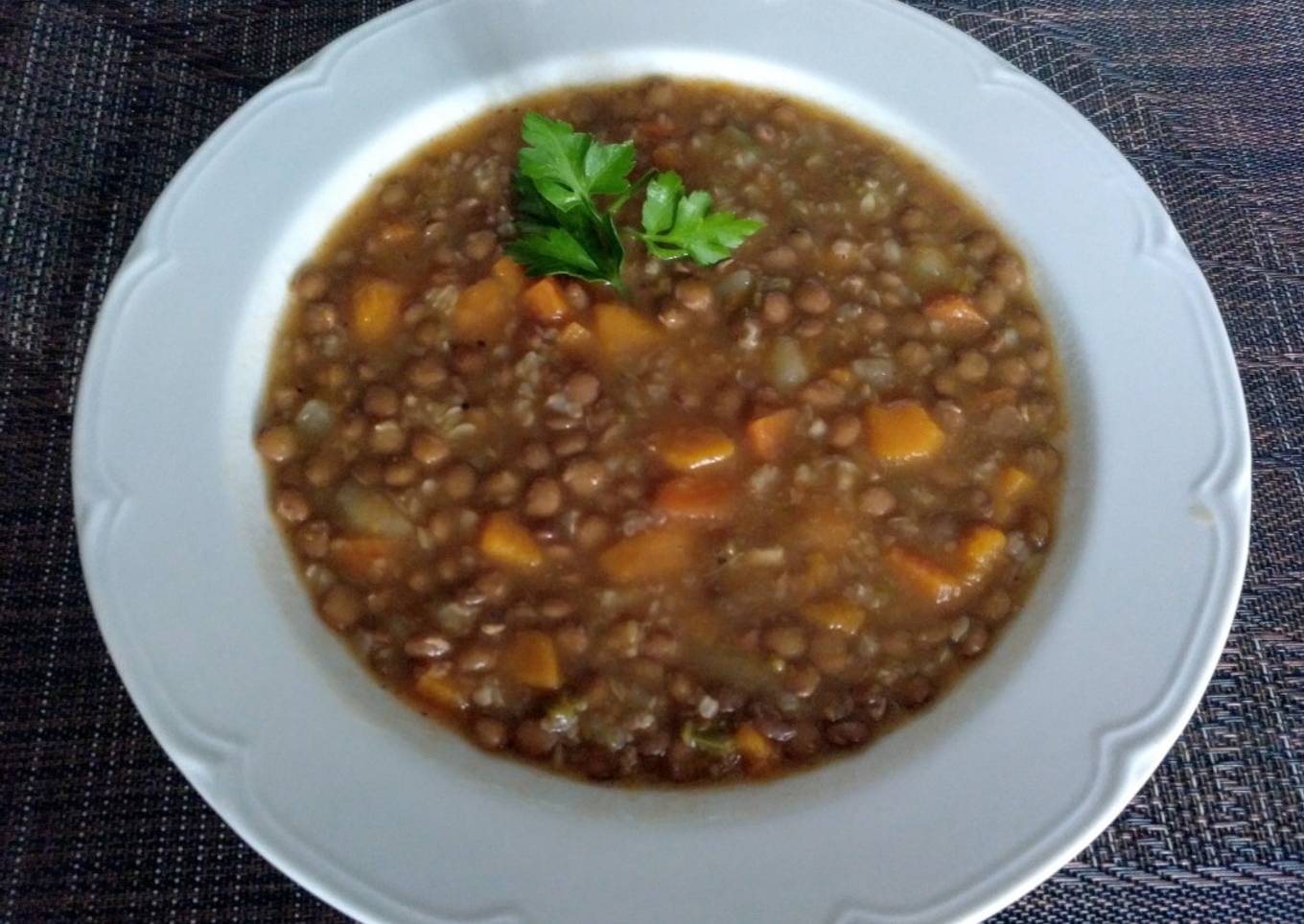 - Se pone una cazuela al fuego se echa un poco de aceite, añadir la cebolla y rehógala agregar los pimientos y proseguir la cocción unos minutos, añadir las zanahorias y la calabaza y rehogar, a continuación incorporar el ajo y el pimentón y mezclar. Se cubre con agua, se añade el laurel, la sal y las lentejas y se cuece a fuego lento unos 20 minutos.