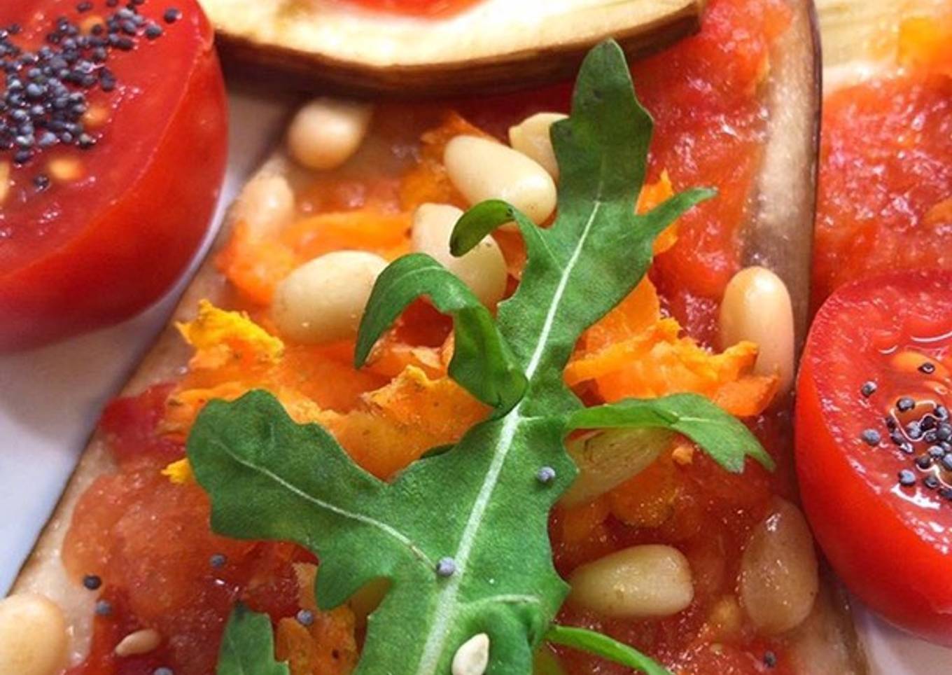 Berenjenas horneadas con tomate semillas y diente de león