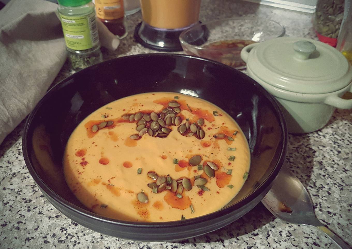 - Servimos con una cucharada de pepitas de calabaza con su aceite. Se puede comer al momento pero está mejor de un día para otro.