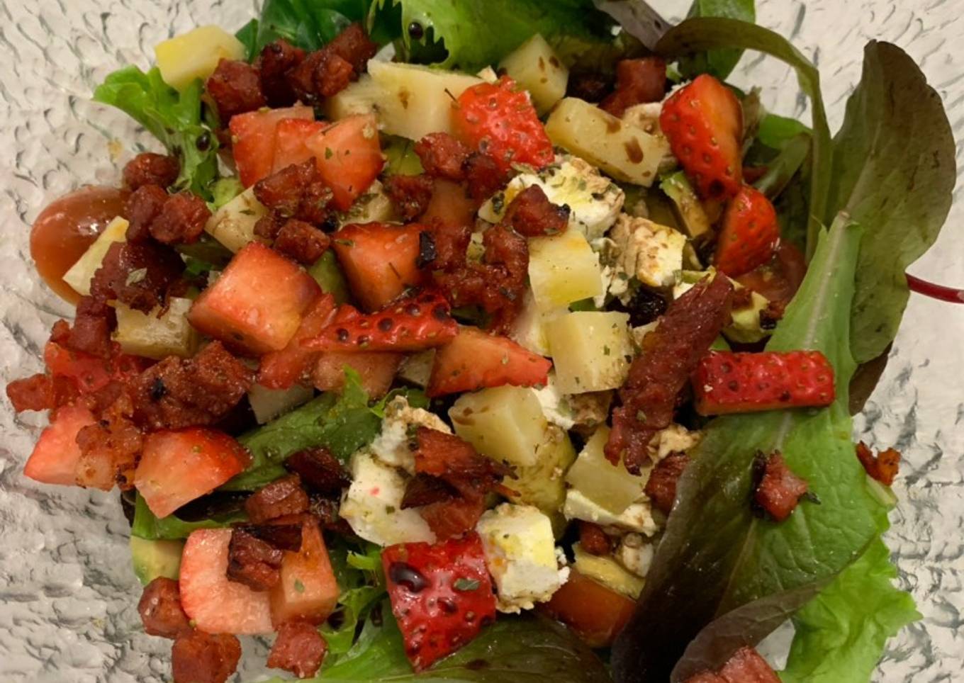 - Vierte el chorizo doradito y por último corta las fresas y añádelas también