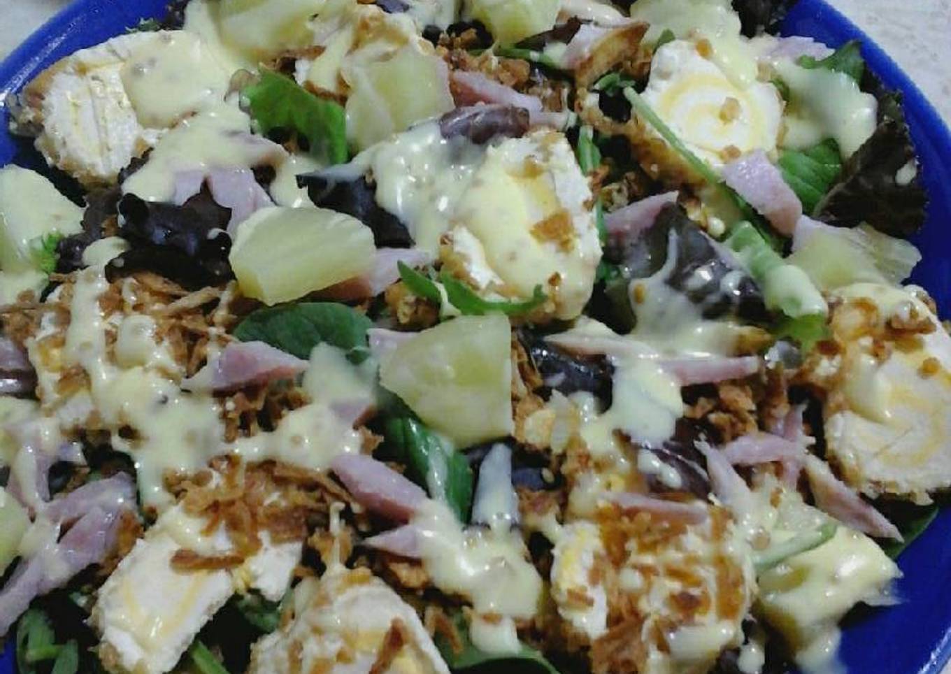 - Poner en una fuente los brotes tiernos, le añadimos la piña en trocitos, el lacón en trocitos pequeños, el queso lo cortamos en trozos finos, y añadir todos los demás ingredientes. Y un chorreón de salsa de mostaza y miel al gusto.
