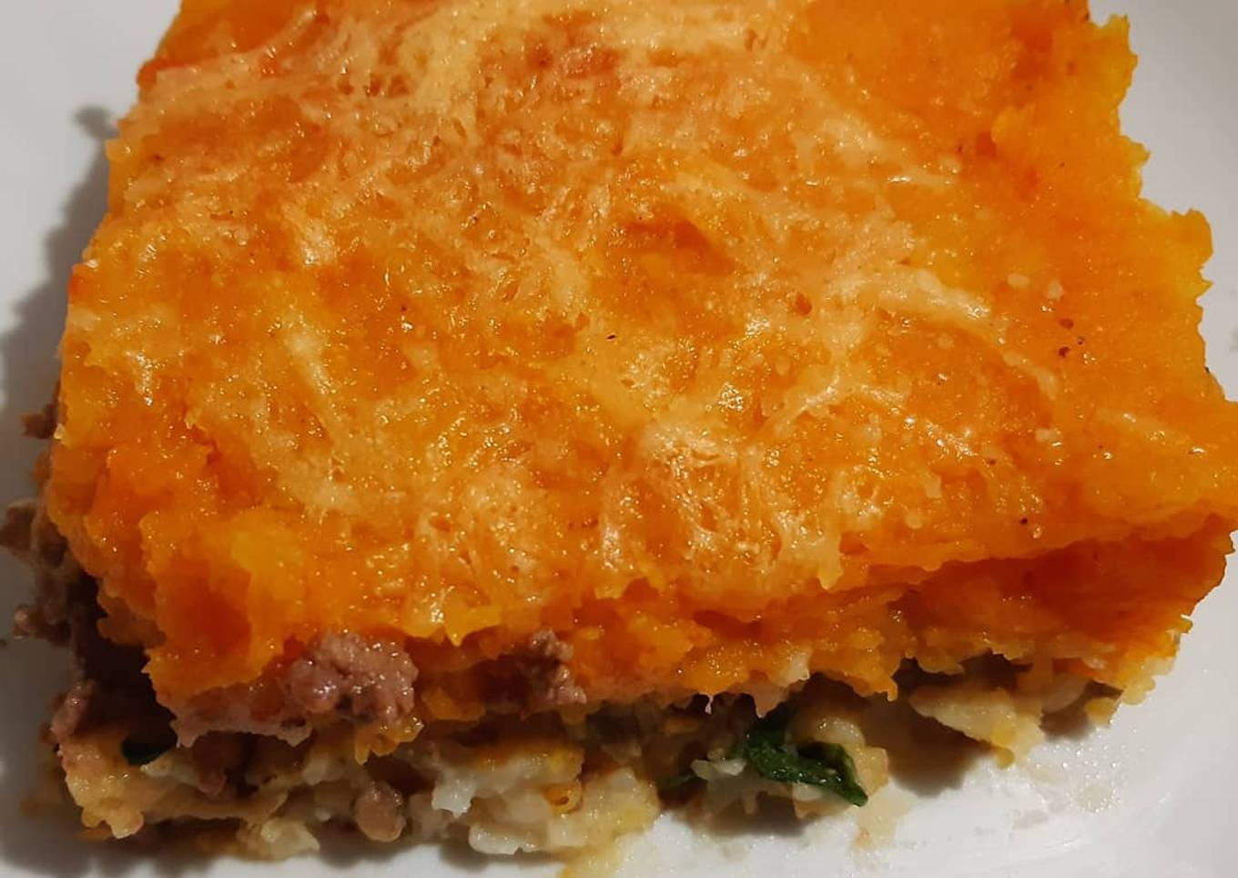 - En una placa:armamos base de puré de papas, relleno de carne y nueva capa de puré de calabaza. Queso rallado y al horno para gratinar! Y listo!!!